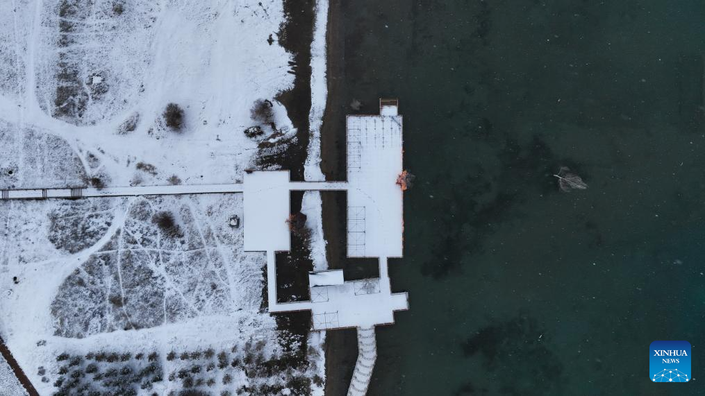An aerial drone photo taken on Nov. 18, 2024 shows a dock for tourist boating service in Qinghai Lake in northwest China's Qinghai Province. (Xinhua/Zhang Long)