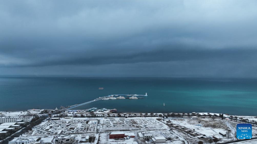 An aerial drone photo taken on Nov. 18, 2024 shows a snow scenery of Qinghai Lake in northwest China's Qinghai Province. (Xinhua/Zhang Long)