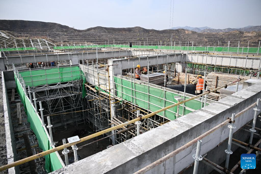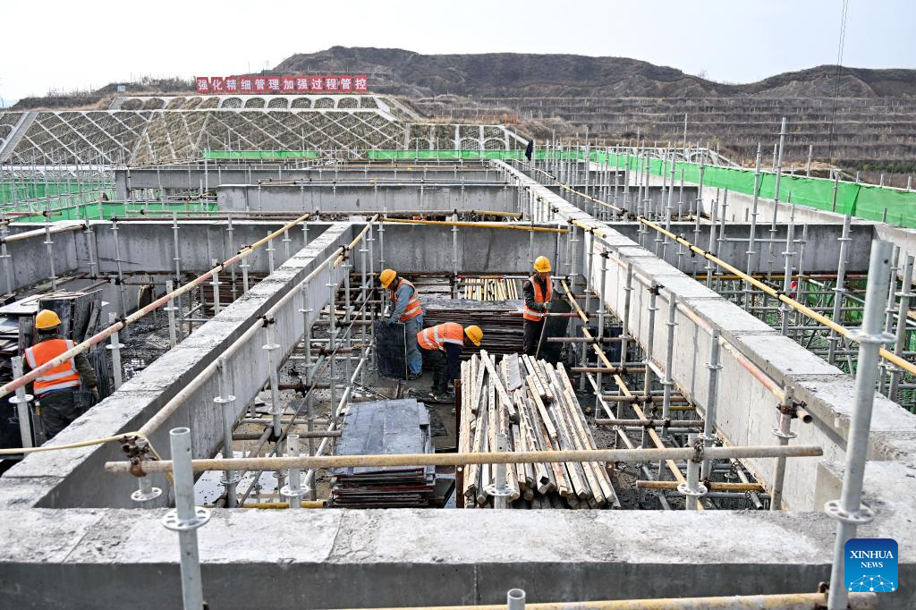 People work at the construction site of Fuping Railway Station of the Xiong'an-Xinzhou High-speed Railway in north China's Hebei Province, Nov. 18, 2024. The construction of the main structure of Fuping Railway Station was capped on Monday, which is now followed by steel structure installation.