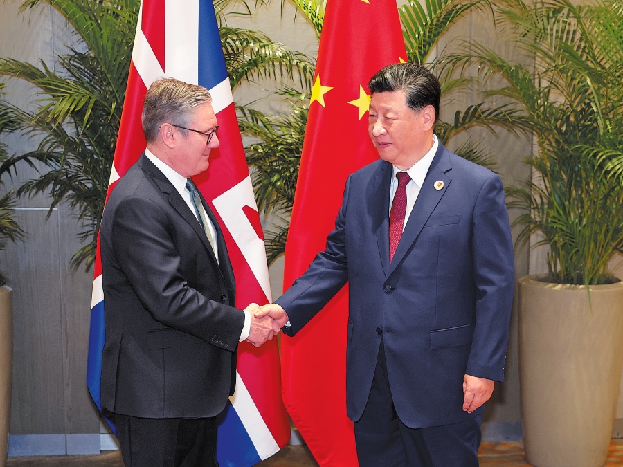 President Xi Jinping shakes hands with British Prime Minister Keir Starmer during their meeting on the sidelines of the 19th G20 Summit in Rio de Janeiro, Brazil, on Monday. (WANG ZHUANGFEI/CHINA DAILY)