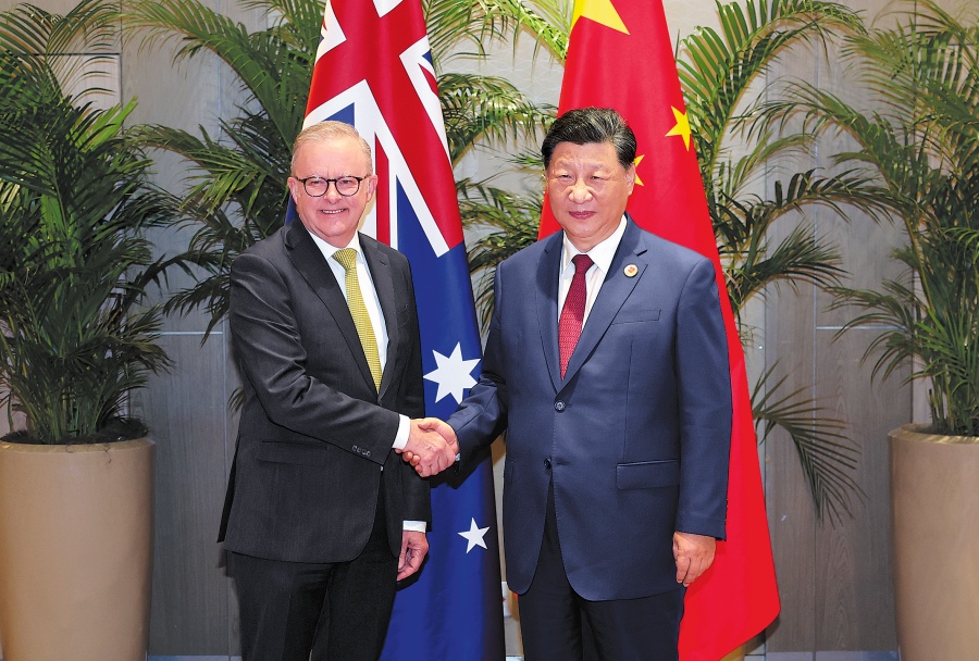 President Xi shakes hands with Australian Prime Minister Anthony Albanese during their meeting on the sidelines of the 19th G20 Summit on Monday. (WANG ZHUANGFEI/CHINA DAILY)