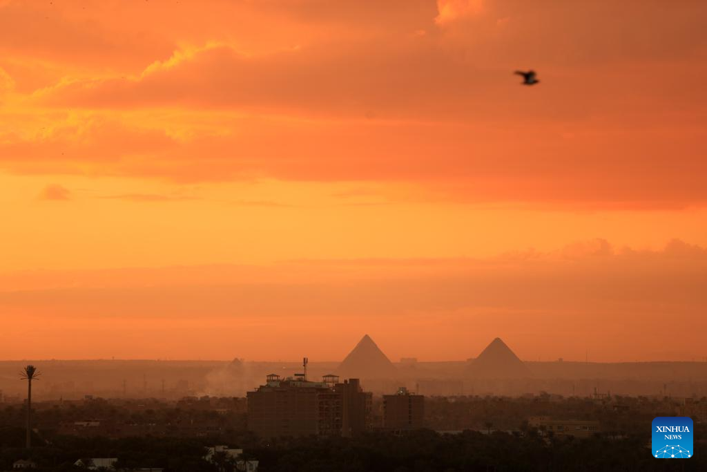 This photo taken on Nov. 18, 2024 shows a view of the Giza Pyramids at sunset in Cairo, Egypt. (Xinhua/Sui Xiankai)