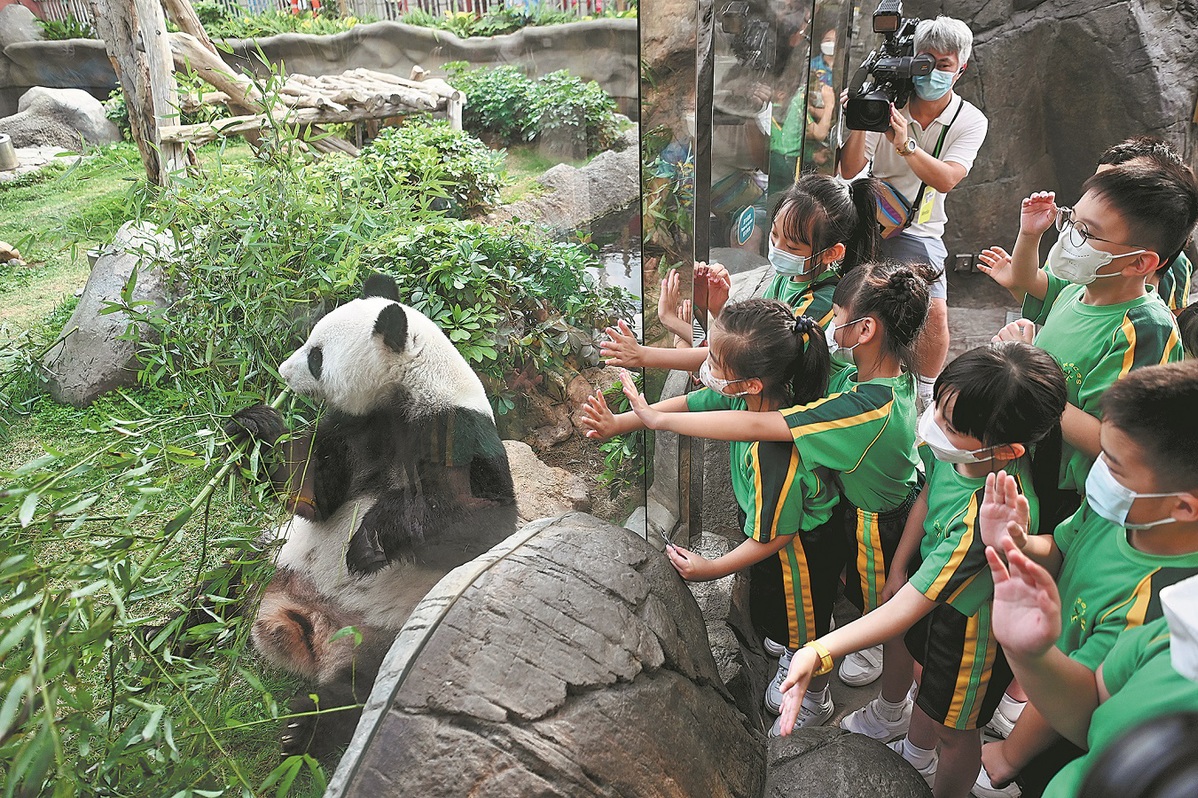 Students greet giant panda Ying Ying at Ocean Park in Hong Kong in 2022. (LI ZHIHUA/CHINA NEWS SERVICE)