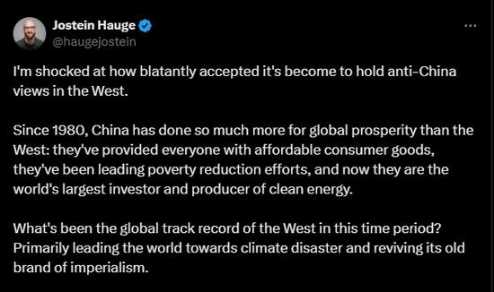 Hauge said in the post that he was shocked at how blatantly anti-China views were accepted in the West.