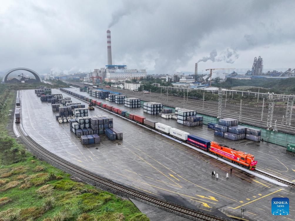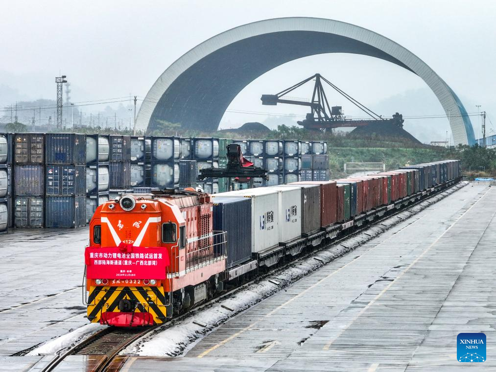 A train loaded with lithium batteries for traction purposes departs from a train station in southwest China's Chongqing, Nov. 19, 2024. Three trains loaded with lithium batteries for traction purposes departed separately from Chongqing, Guiyang and Yibin on Tuesday, marking the first large scale test run for rail transportation of such batteries in China. A new type of container enhanced with multiple safety measures including smoke sensing and pressure releasing has been deployed to effectively reduce potential risks during transportation. (Xinhua/Zhang Ziyu)