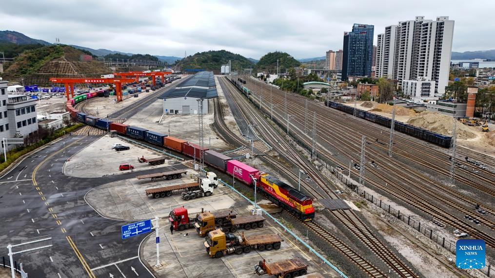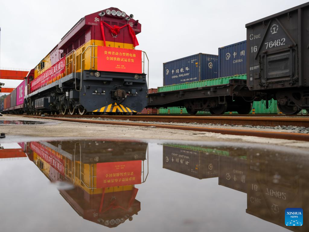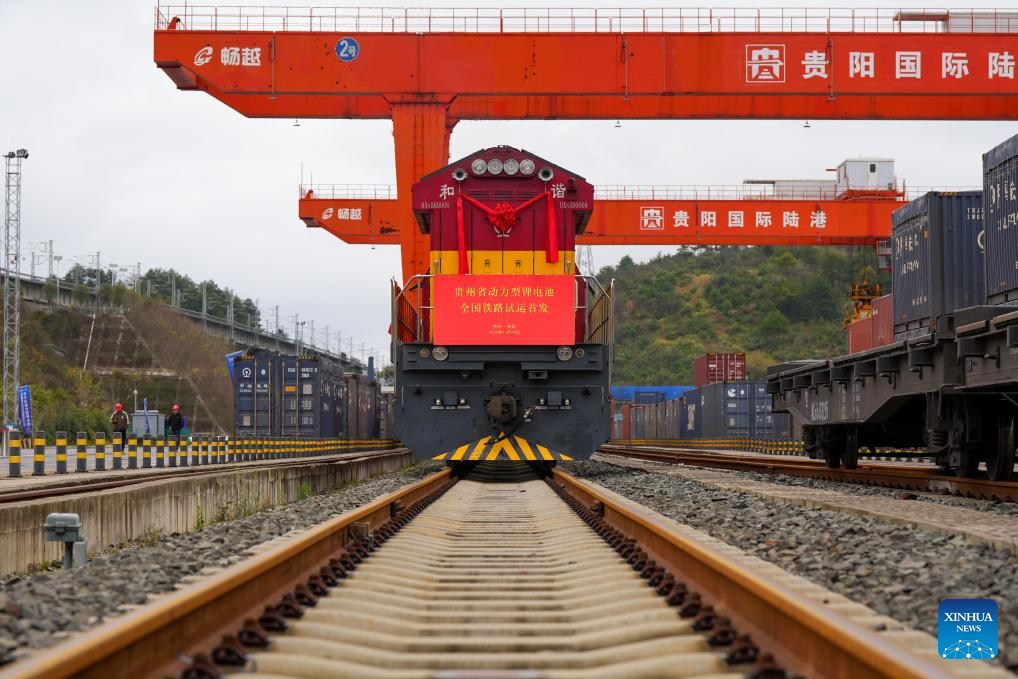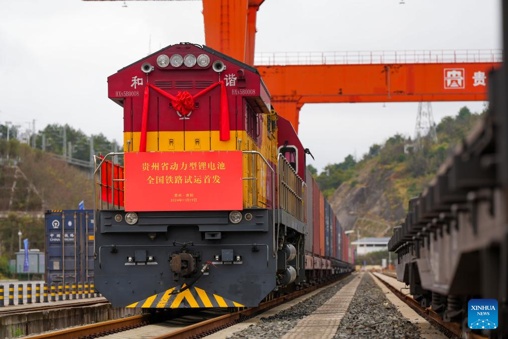 A train loaded with lithium batteries for traction purposes is pictured at Dulaying international land-sea logistics port in Guiyang, southwest China's Guizhou Province, Nov. 19, 2024. Three trains loaded with lithium batteries for traction purposes departed separately from Chongqing, Guiyang and Yibin on Tuesday, marking the first large scale test run for rail transportation of such batteries in China.