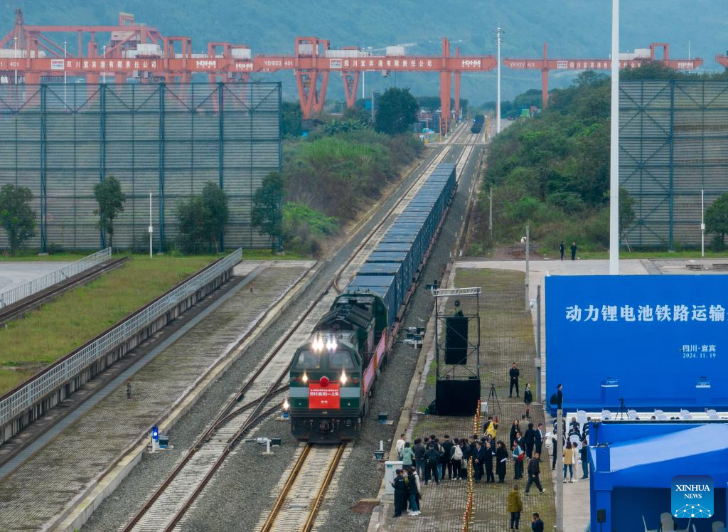 A train loaded with lithium batteries for traction purposes is about to depart from Yibin Port in Yibin, southwest China's Sichuan Province, Nov. 19, 2024. Three trains loaded with lithium batteries for traction purposes departed separately from Chongqing, Guiyang and Yibin on Tuesday, marking the first large scale test run for rail transportation of such batteries in China.