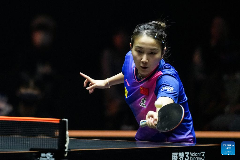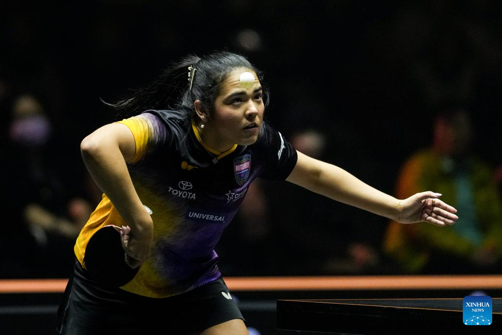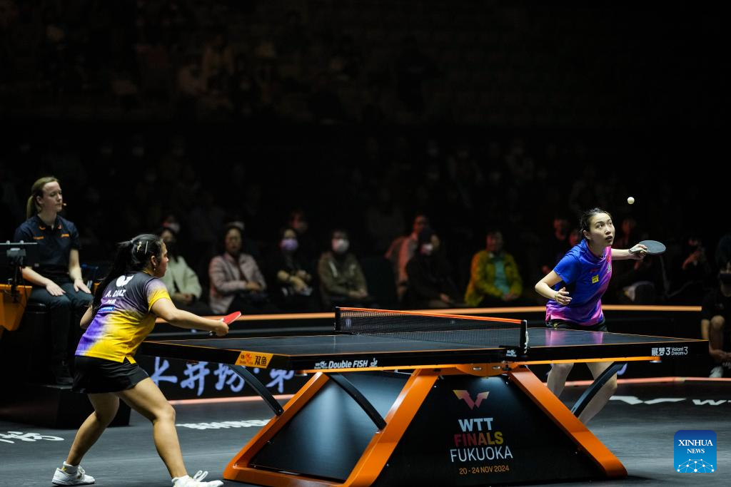 Qian Tianyi of China hits a return during the women's singles round of 16 match between Qian Tianyi of China and Adriana Diaz of Puerto Rico at World Table Tennis (WTT) Finals Fukuoka 2024 in Kitakyushu, Japan, Nov. 20, 2024. (Xinhua/Zhang Xiaoyu)