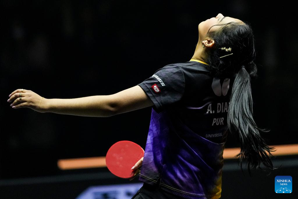 Adriana Diaz of Puerto Rico serves the ball during the women's singles round of 16 match between Qian Tianyi of China and Adriana Diaz of Puerto Rico at World Table Tennis (WTT) Finals Fukuoka 2024 in Kitakyushu, Japan, Nov. 20, 2024. (Xinhua/Zhang Xiaoyu)