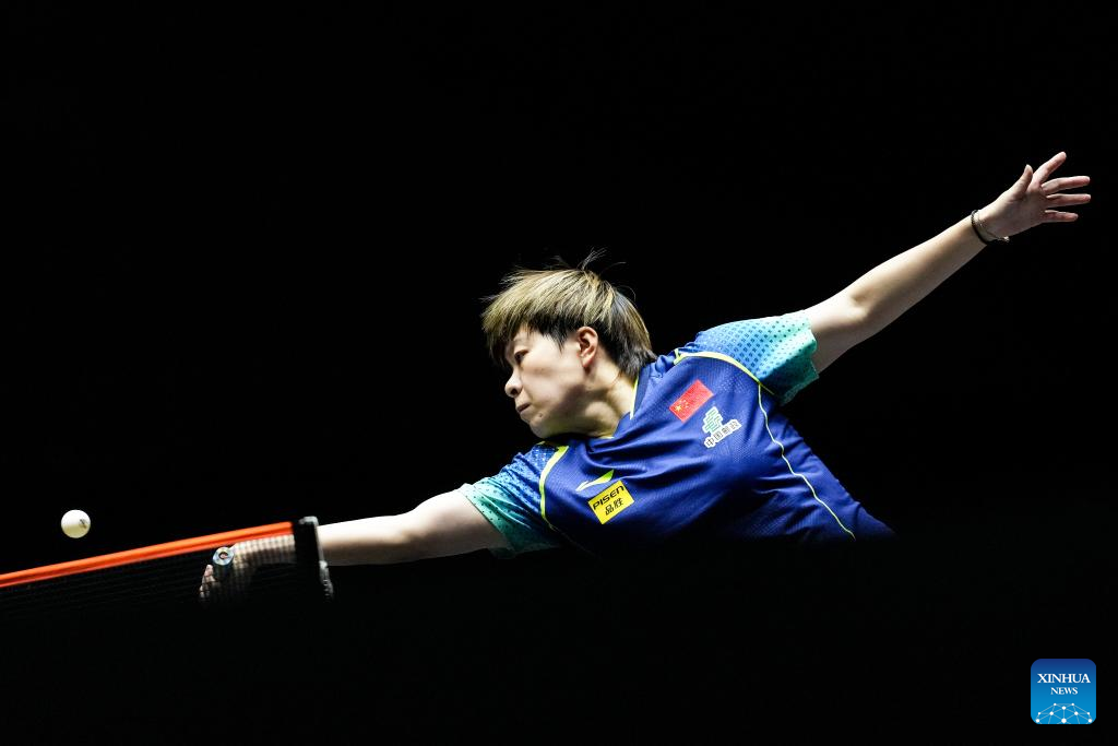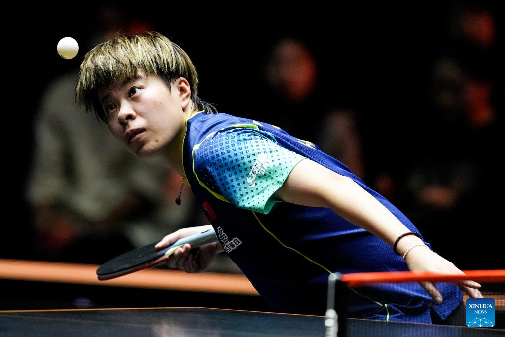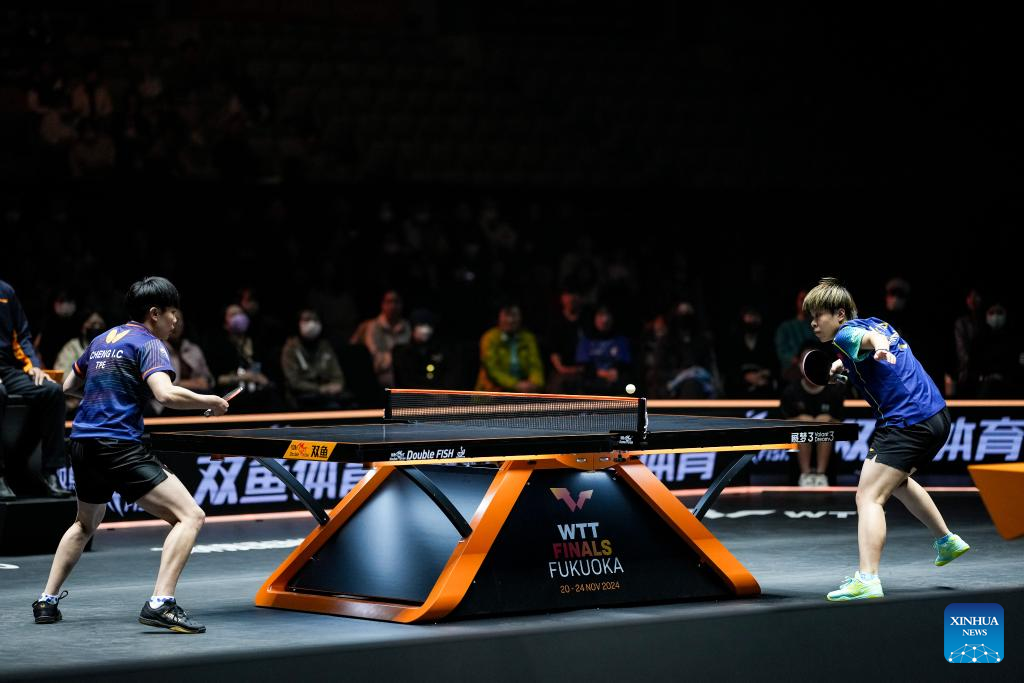 Wang Yidi of China hits a return during the women's singles round of 16 match against Cheng I-Ching of Chinese Taipei at World Table Tennis (WTT) Finals Fukuoka 2024 in Kitakyushu, Japan, Nov. 20, 2024. (Xinhua/Zhang Xiaoyu)