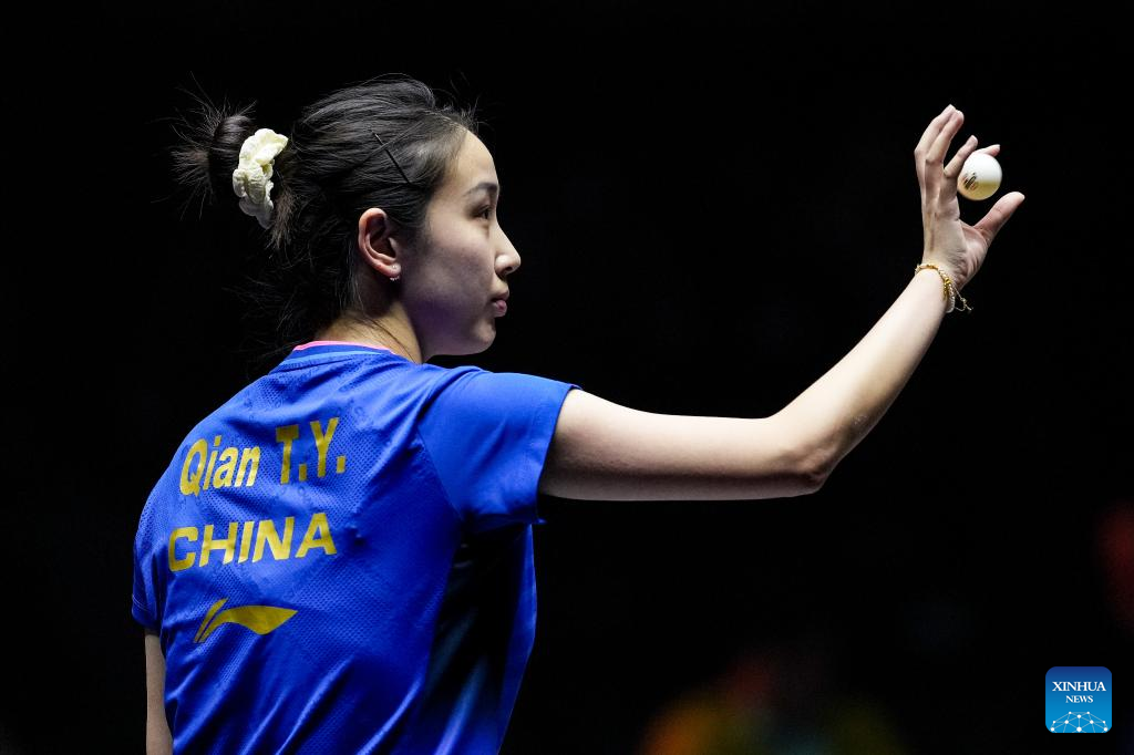 Qian Tianyi of China catches the ball during the women's singles round of 16 match between Qian Tianyi of China and Adriana Diaz of Puerto Rico at World Table Tennis (WTT) Finals Fukuoka 2024 in Kitakyushu, Japan, Nov. 20, 2024. (Xinhua/Zhang Xiaoyu)