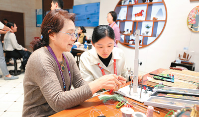 An artisan, left, demonstrates handicraft-making at the seventh China International Import Expo in Shanghai. (Xinhua/Du Xiaoyi)