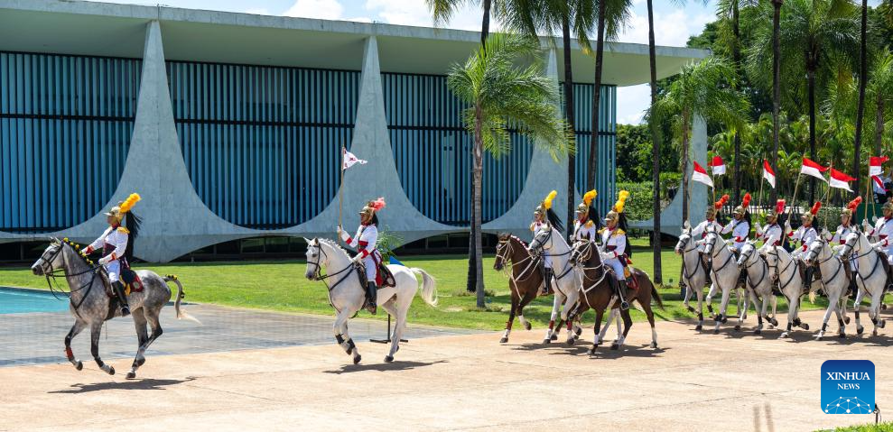 Brazilian President Luiz Inacio Lula da Silva and his wife Rosangela da Silva warmly welcome Chinese President Xi Jinping and hold a grand welcome ceremony for Xi, prior to the talks between Xi and Lula, in Brasilia, Brazil, Nov. 20, 2024. Xi on Wednesday held talks with Lula in Brasilia. (Xinhua/Ding Lin)