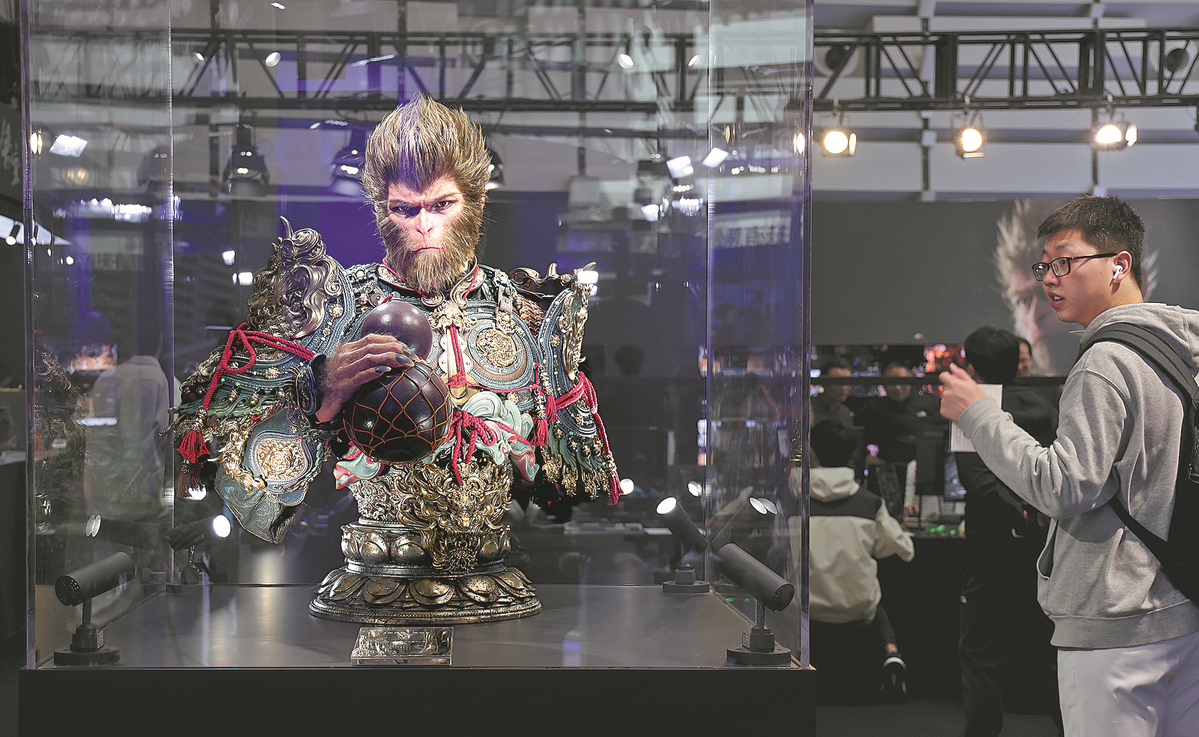 A bust of Wukong, the protagonist of the Chinese video game Black Myth: Wukong, is displayed on Wednesday at the booth of Game Science, the developer of the popular game, at the Light of Internet Expo in Wuzhen, Zhejiang province. The expo is part of the 2024 World Internet Conference Wuzhen Summit. (WANG JING/CHINA DAILY)