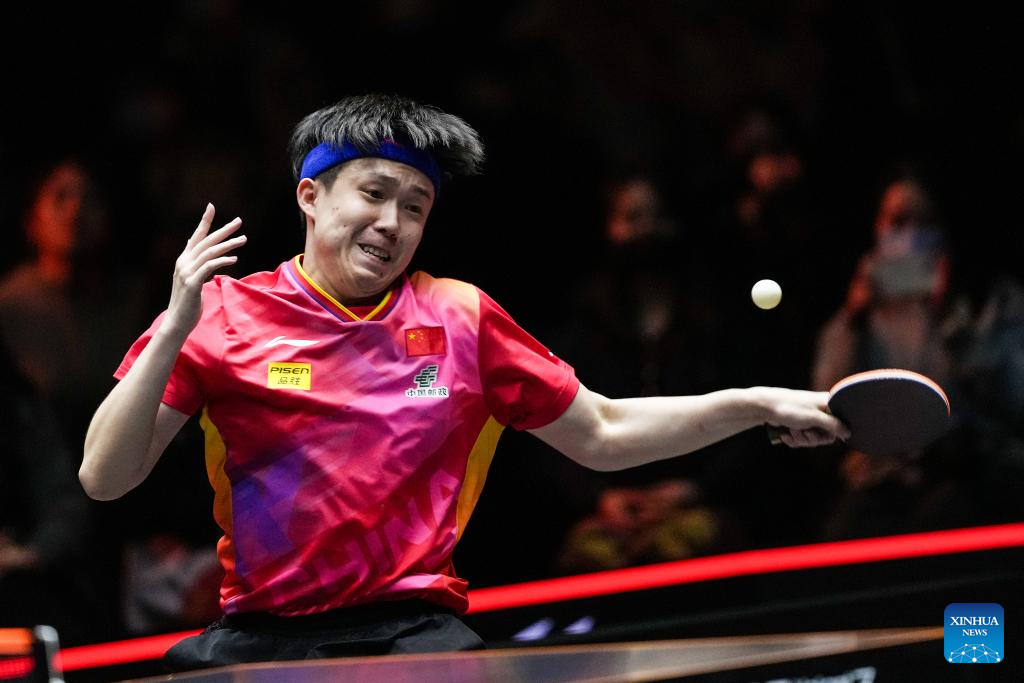 Wang Chuqin returns the ball during the men's singles round of 16 match between Wang Chuqin of China and Patrick Franziska of Germany at World Table Tennis (WTT) Finals Fukuoka 2024 in Kitakyushu, Japan, Nov. 21, 2024. (Xinhua/Zhang Xiaoyu)