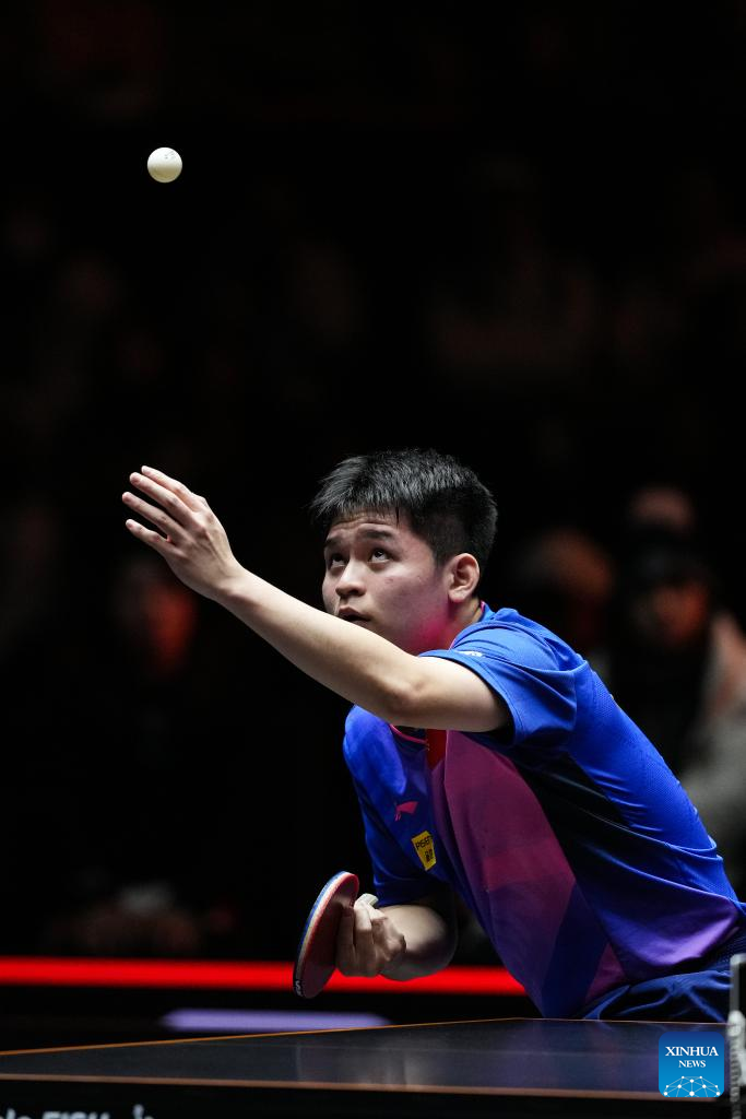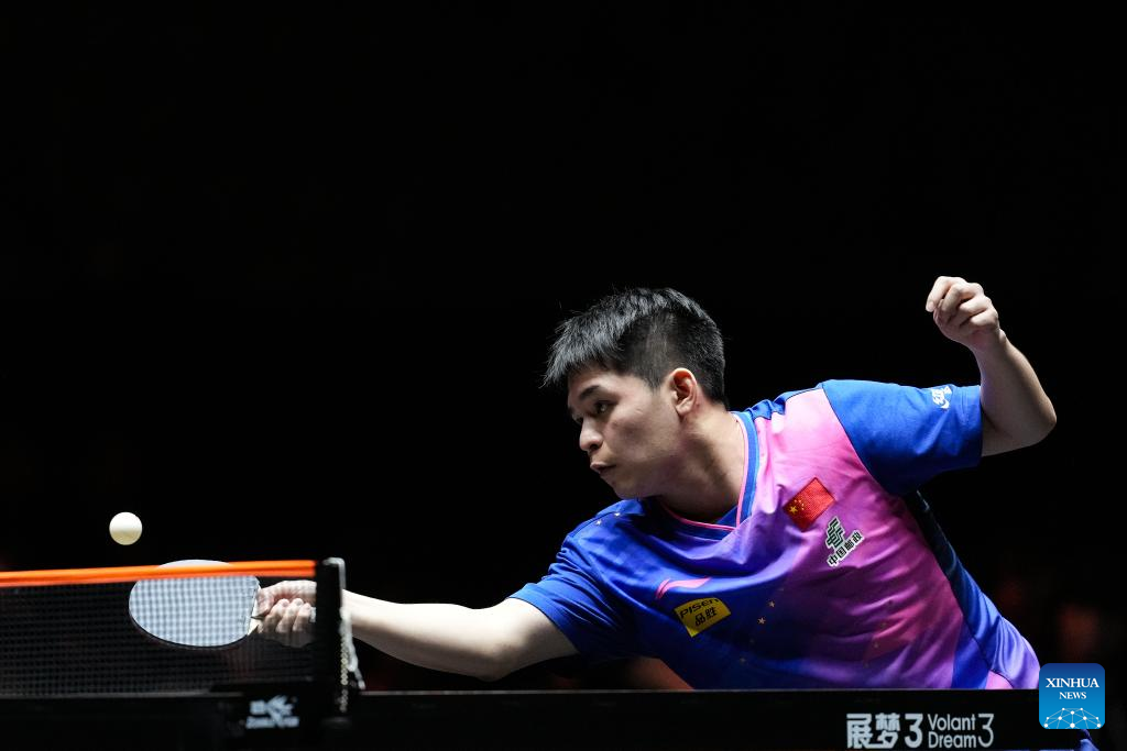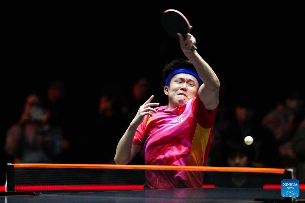 Lin Shidong returns the ball during the men's singles round of 16 between Lin Shidong of China and Alexis Lebrun of France at World Table Tennis (WTT) Finals Fukuoka 2024 in Kitakyushu, Japan, Nov. 21, 2024. (Xinhua/Zhang Xiaoyu)