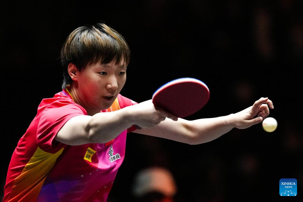 Chen Xingtong of China hits a return during the women's singles round of 16 between Sun Yingsha of China and Chen Xingtong of China at World Table Tennis (WTT) Finals Fukuoka 2024 in Kitakyushu, Japan, on Nov. 21, 2024. (Xinhua/Zhang Xiaoyu)