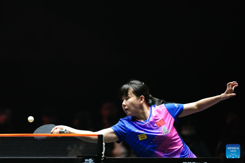 Wang Manyu of China hits a return during the women's singles round of 16 between Wang Manyu of China and Shin Yubin of South Korea at World Table Tennis (WTT) Finals Fukuoka 2024 in Kitakyushu, Japan, on Nov. 21, 2024. (Xinhua/Zhang Xiaoyu)