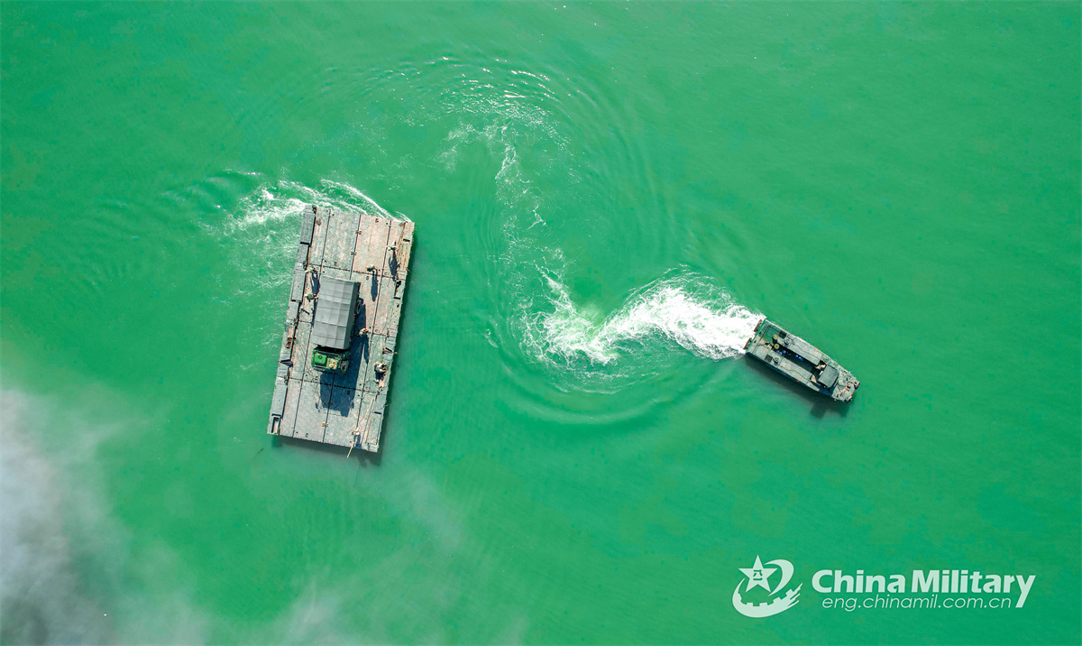 A propulsion boat attached to a pontoon unit under the Chinese PLA 71st Group Army tows a pontoon bridge carrying a military vehicle during a river-crossing engineering support training exercise on October 25, 2024. (eng.chinamil.com.cn/Photo by Song Tangchun)