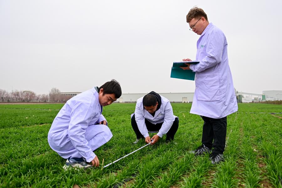 Staff members measure the spacing of wheat seedlings at a seed company in Changji City, northwest China's Xinjiang Uygur Autonomous Region, Nov. 7, 2024. (Xinhua/Ding Lei)
