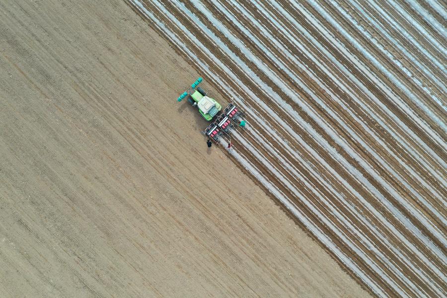 An aerial drone photo taken on March 21, 2024 shows a seed planter at work in a field in Tianhai Village of Liuyuan Town, Aksu City, northwest China's Xinjiang Uygur Autonomous Region. (Xinhua/Ding Lei)