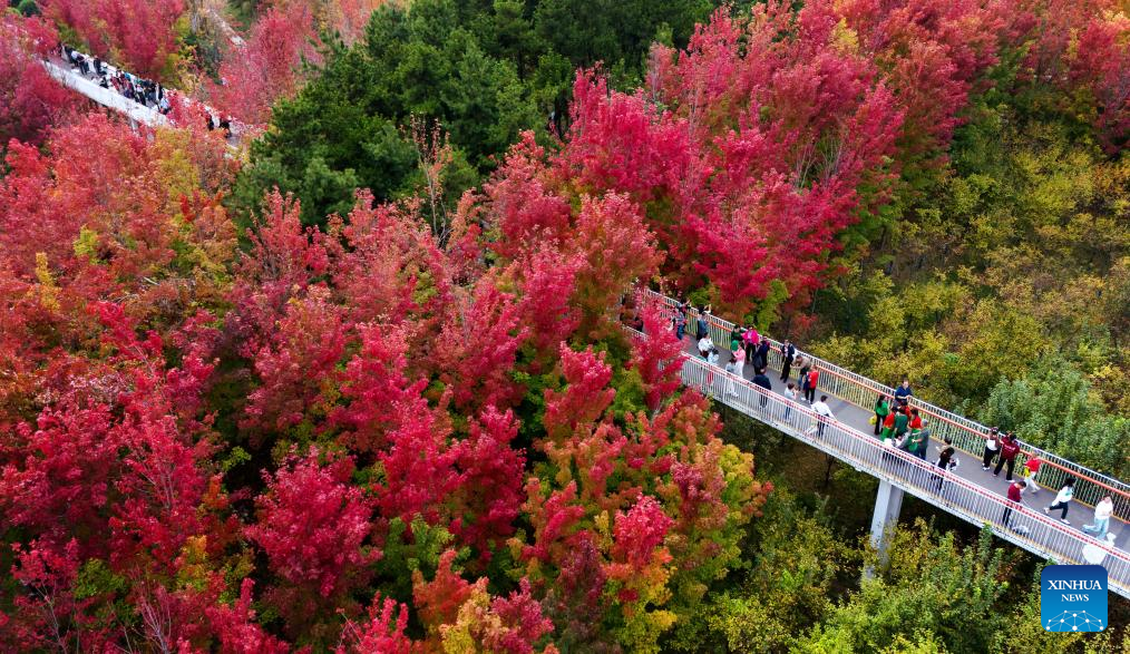 An aerial drone photo taken on Oct. 18, 2024 shows people visiting the Yannan Park in Xi'an, northwest China's Shaanxi Province. (Xinhua/Zou Jingyi)