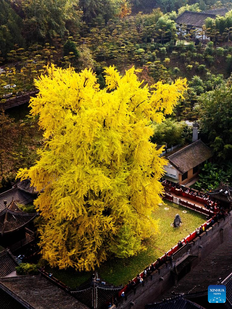 An aerial drone photo taken on Nov. 6, 2024 shows an ancient ginkgo tree in a temple in Xi'an, northwest China's Shaanxi Province. (Xinhua/Zou Jingyi)