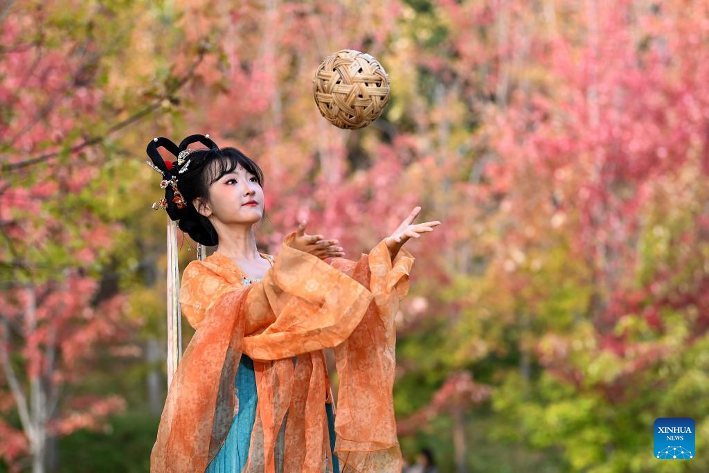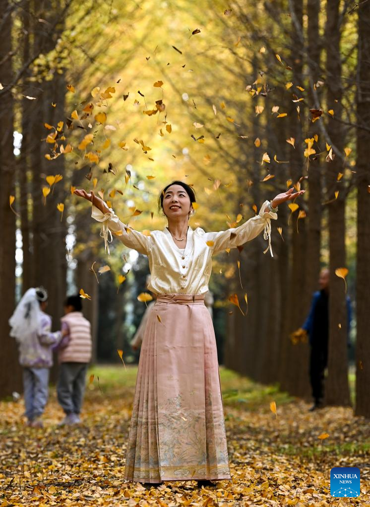 A tourist in traditional Chinese costumes poses for photos at the Yannan Park in Xi'an, northwest China's Shaanxi Province, Oct. 18, 2024. (Xinhua/Zou Jingyi)
