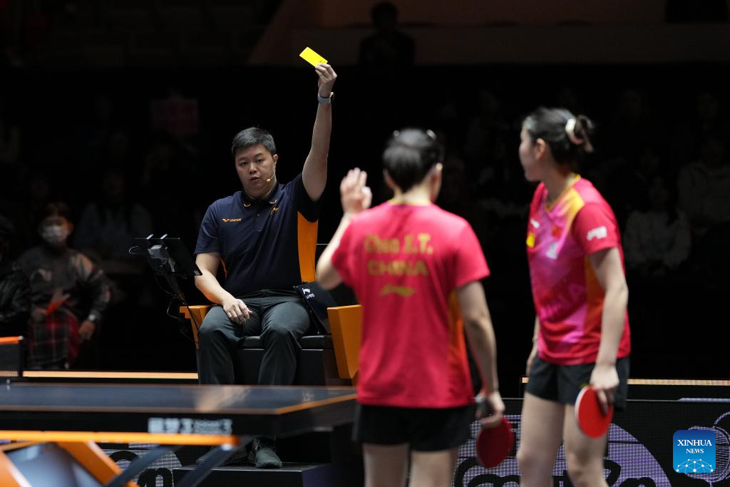 Qian Tianyi (R)/Chen Xingtong (C) of China are given a yellow card during the women's doubles semifinal between Qian Tianyi/Chen Xingtong of China and Sato Hitomi/Hashimoto Honoka of Japan at World Table Tennis (WTT) Finals Fukuoka 2024 in Kitakyushu, Japan, Nov. 22, 2024. (Xinhua/Zhang Xiaoyu)
