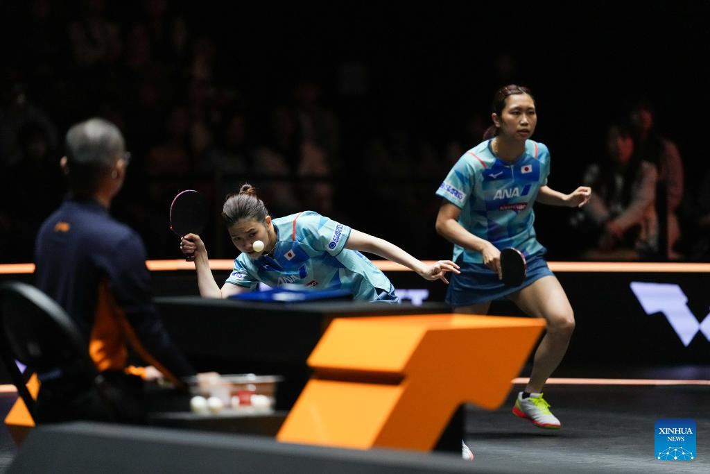 Sato Hitomi (R)/Hashimoto Honoka of Japan compete during the women's doubles semifinal between Qian Tianyi/Chen Xingtong of China and Sato Hitomi/Hashimoto Honoka of Japan at World Table Tennis (WTT) Finals Fukuoka 2024 in Kitakyushu, Japan, Nov. 22, 2024. (Xinhua/Zhang Xiaoyu)