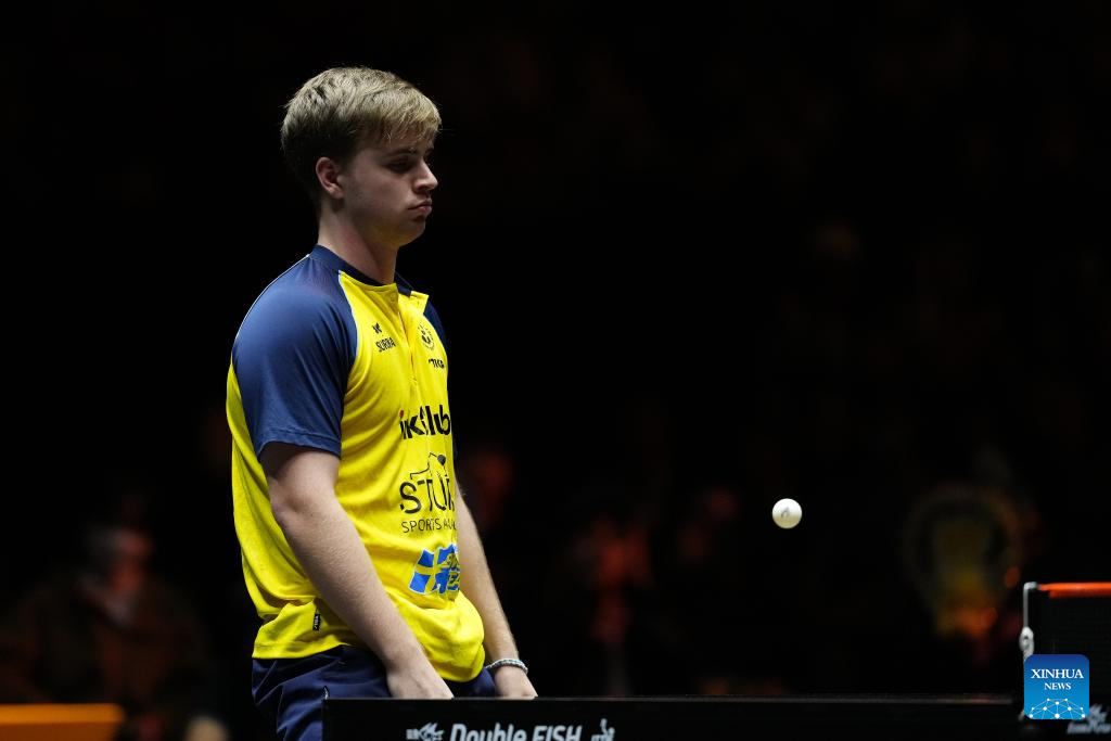Truls Moregard hits a return during the men's singles quarterfinal match between Wang Chuqin of China and Truls Moregard of Sweden at World Table Tennis (WTT) Finals Fukuoka 2024 in Kitakyushu, Japan, on Nov. 22, 2024. (Xinhua/Zhang Xiaoyu)