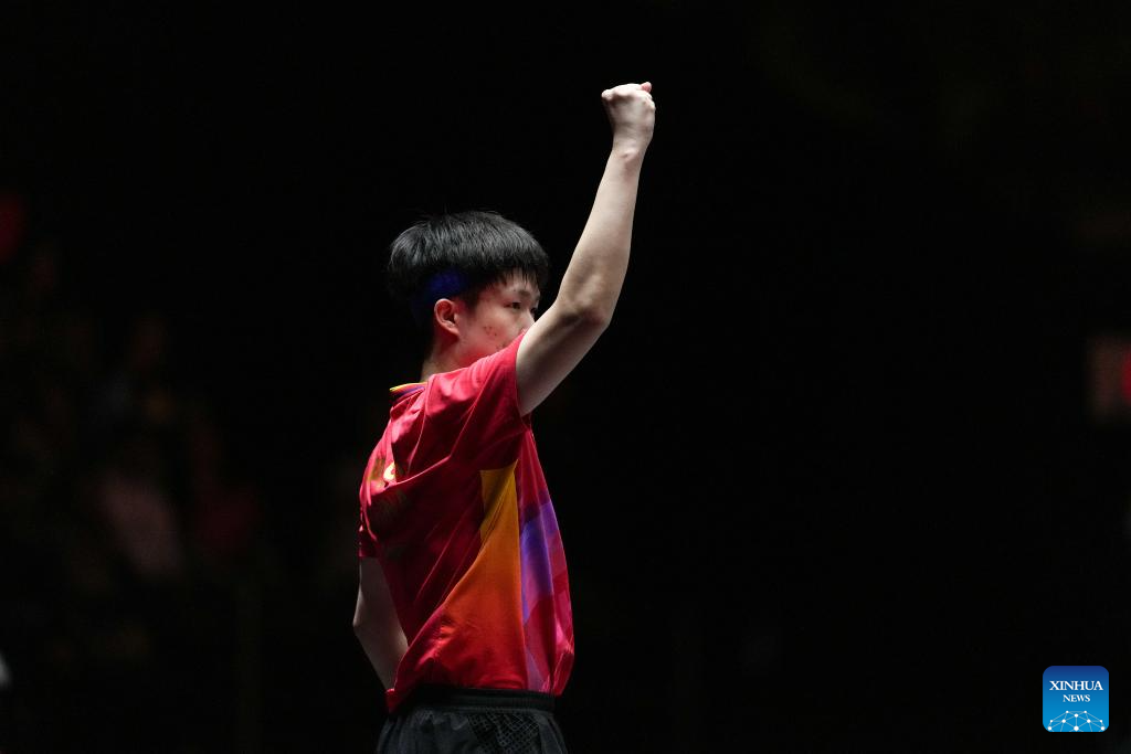 Wang Chuqin celebrates scoring during the men's singles quarterfinal match between Wang Chuqin of China and Truls Moregard of Sweden at World Table Tennis (WTT) Finals Fukuoka 2024 in Kitakyushu, Japan, on Nov. 22, 2024. (Xinhua/Zhang Xiaoyu)