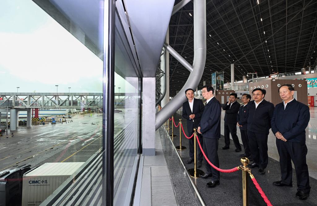 Wang Huning, a member of the Standing Committee of the Political Bureau of the Communist Party of China (CPC) Central Committee and chairman of the National Committee of the Chinese People's Political Consultative Conference, learns about the operation of the Hainan Free Trade Port at the Xinhai Port in Haikou, south China's Hainan Province, Nov. 20, 2024. Wang made an inspection tour in south China's Hainan Province from Wednesday to Friday. (Xinhua/Rao Aimin)