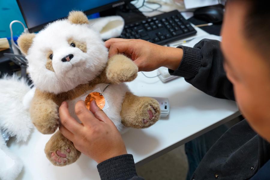 A researcher tests a stuffed panda toy's sensing vocal parts at a workshop of SeeU Panda in Chengdu, southwest China's Sichuan Province, Nov. 21, 2024. (Xinhua/Shen Bohan)