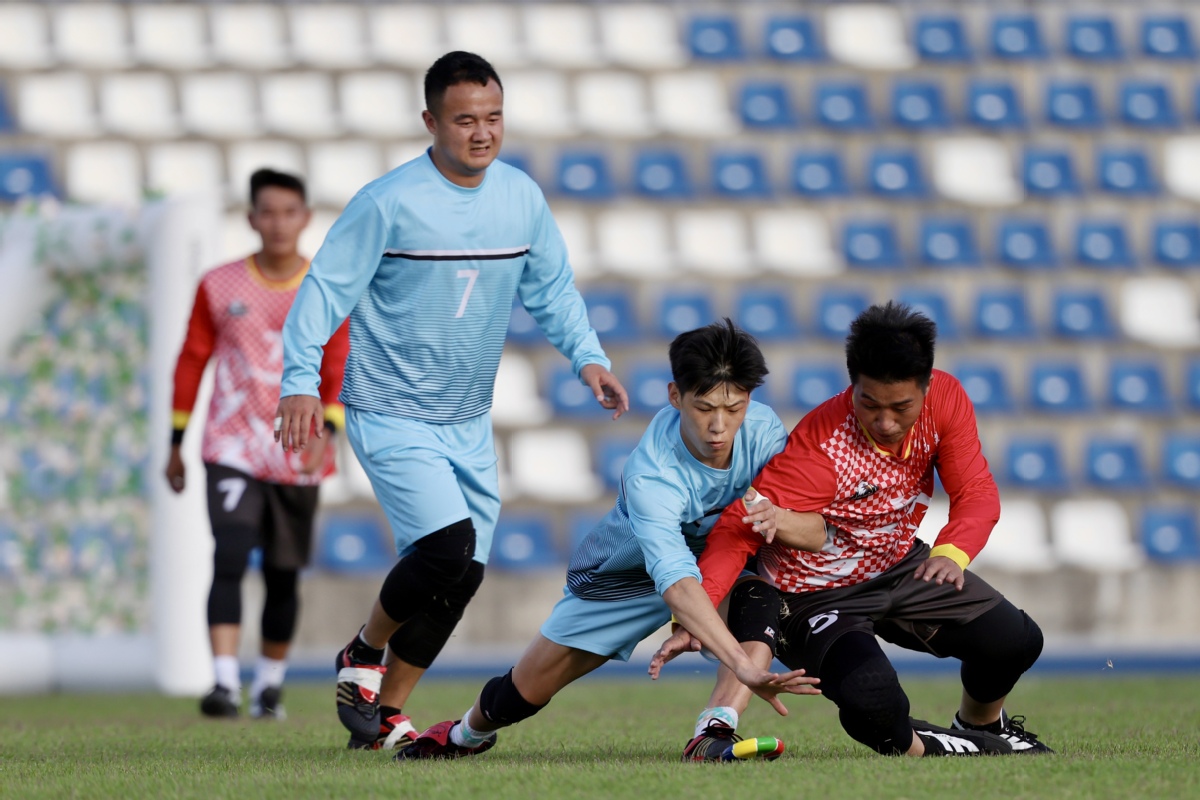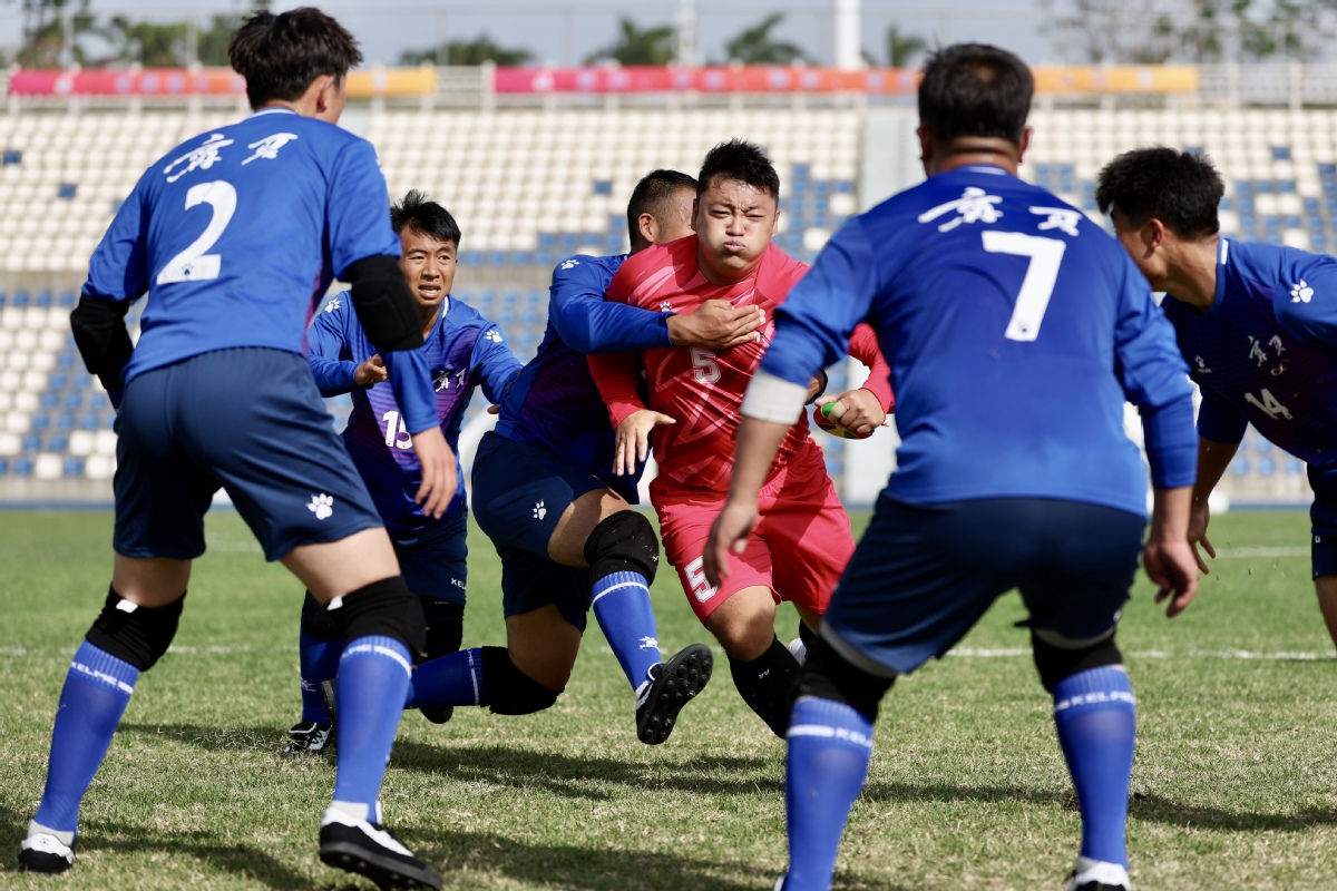 Huapao, a traditional Chinese rugby-like sport is played between teams from Xizang autonomous region (red) and Hebei at the 12th National Traditional Games of Ethnic Minorities of the People's Republic of China on Saturday in South China's Hainan province. The Hebei team lost at 1:3. (Photo by Wei Xiaohao/chinadaily.com.cn)