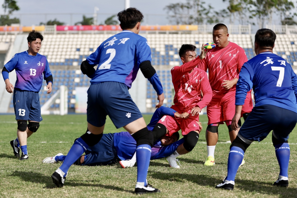 Huapao, a traditional Chinese rugby-like sport is played between Guizhou (red) and Ningxia teams at the 12th National Traditional Games of Ethnic Minorities of the People's Republic of China on Saturday in South China's Hainan province. The Guizhou team lost at 4:13. (Photo by Wei Xiaohao/chinadaily.com.cn)