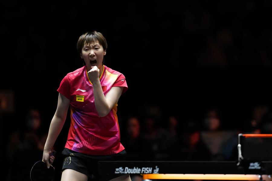 Wang Manyu celebrates a point during the women's singles final against Chen Xingtong at the World Table Tennis (WTT) Finals. (Xinhua/Zhang Xiaoyu)