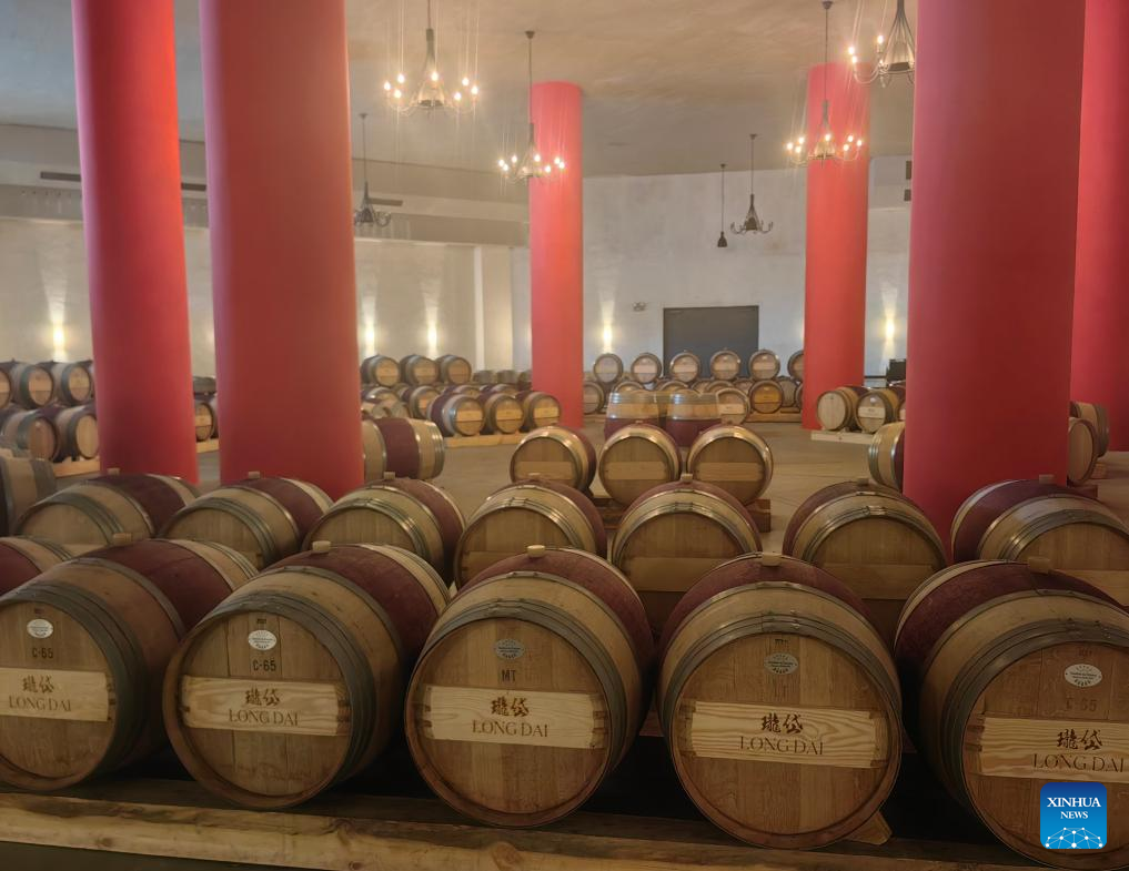 This photo taken on April 10, 2024 shows oak barrels in the Domaine de Long Dai winery in Penglai District of Yantai, east China's Shandong Province. (Xinhua/Shao Kun)