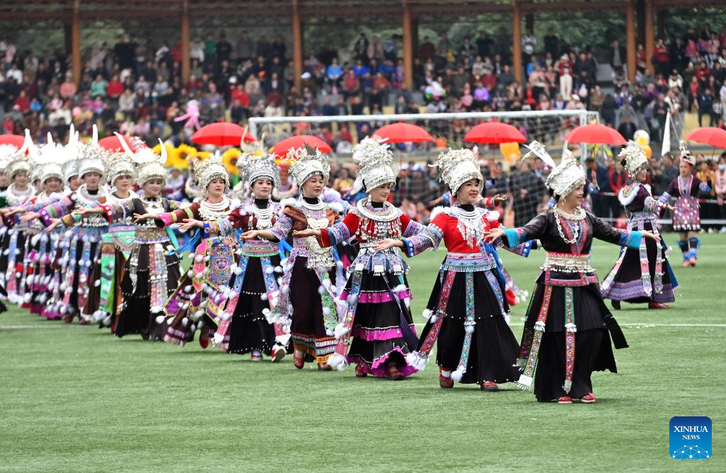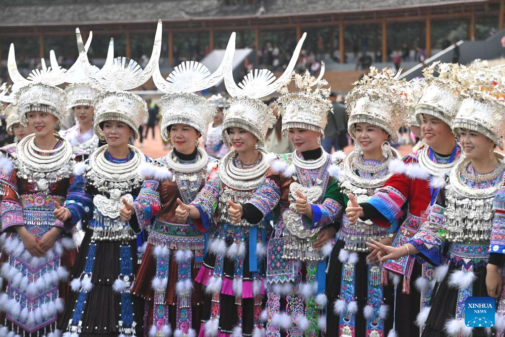 People in traditional costumes participate in Lusheng and horse fighting festival held in Rongshui Miao Autonomous County of Liuzhou, south China's Guangxi Zhuang Autonomous Region, Nov. 23, 2024. Lusheng is a folk musical instrument made of bamboo pipes. (Xinhua/Huang Xiaobang)