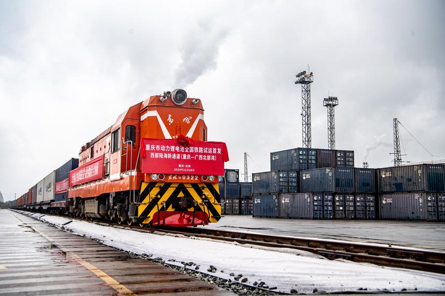 A train loaded with lithium batteries for traction purposes is about to depart from a train station in southwest China's Chongqing, Nov. 19, 2024. (Xinhua/Tang Yi)