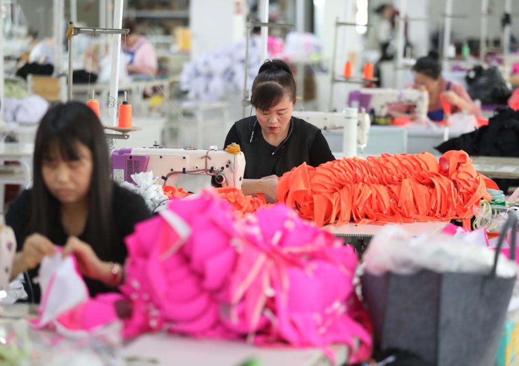 Workers make swimming suits in the production workshop of a swimwear company in Xingcheng, northeast China's Liaoning Province, on April 18, 2024. (Xinhua/Yang Qing)