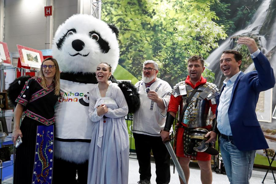 Visitors pose for photos with a giant panda mascot of China's stand at the autumn edition of Romania's Tourism Fair in Bucharest, Romania, Nov. 22, 2024. China's stand attracted visitors at Romania's Tourism Fair, which is held here from Nov. 21-24, as China has expanded its visa-free policy to nine additional countries. (Photo by Cristian Cristel/Xinhua)