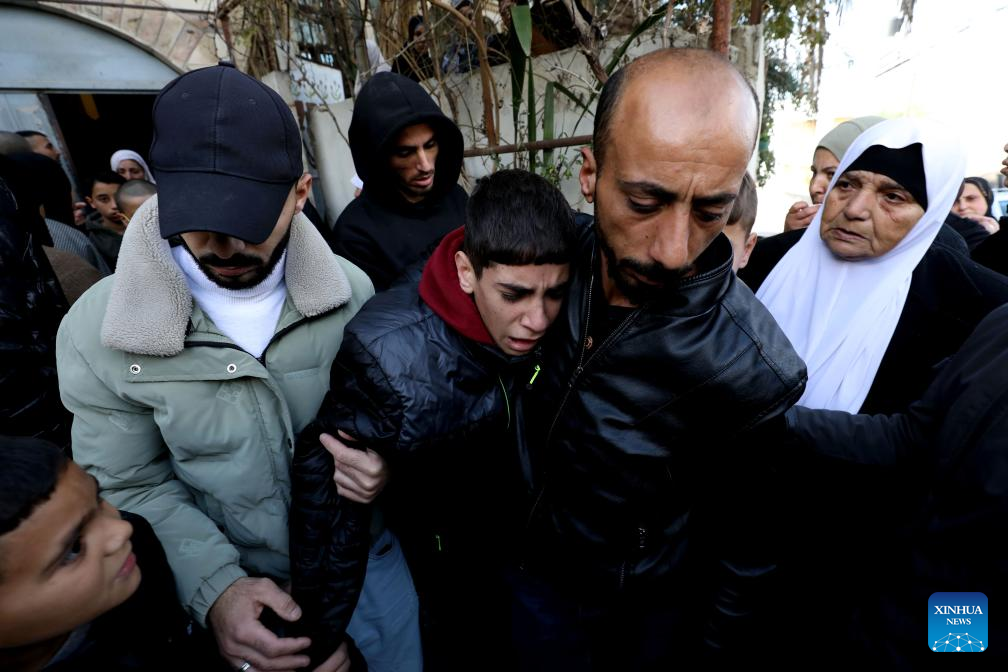 Relatives mourn during the funeral of two Palestinians killed by Israeli forces during a raid in Jenin, northern West Bank, on Nov. 25, 2024. A Palestinian teenager and a young man were shot dead on Sunday night by the Israeli army during a raid on the town of Ya'bad, south of Jenin, in the northern West Bank, according to a Palestinian medical official on Monday. (Photo by Nidal Eshtayeh/Xinhua)