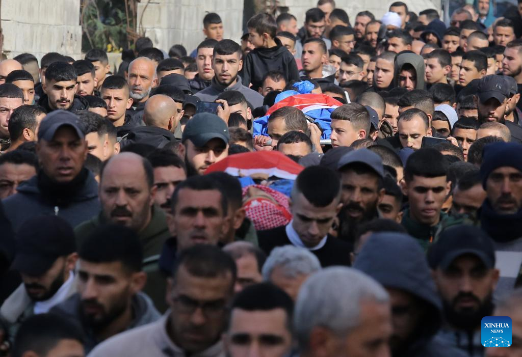 Mourners attend the funeral of two Palestinians killed by Israeli forces during a raid in Jenin, northern West Bank, on Nov. 25, 2024. A Palestinian teenager and a young man were shot dead on Sunday night by the Israeli army during a raid on the town of Ya'bad, south of Jenin, in the northern West Bank, according to a Palestinian medical official on Monday. (Photo by Nidal Eshtayeh/Xinhua)