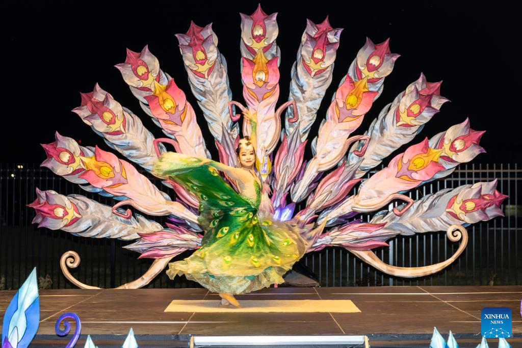A dancer from China performs at the Tianyu Lights Festival in the suburb of Dallas, Texas, the United States, on Nov. 24, 2024. The event, running from Nov. 8, 2024 to Jan. 18, 2025, showcases stunning luminous art installations and nightly performances by acrobats and folk artists from China. (Photo by Dan Tian/Xinhua)