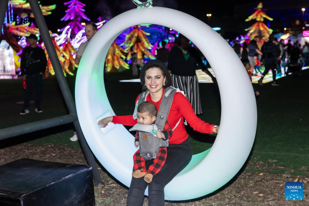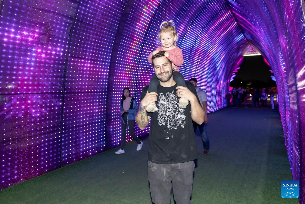 A father carrying a child on his shoulders enjoys the light show at the Tianyu Lights Festival in the suburb of Dallas, Texas, the United States, on Nov. 24, 2024. The event, running from Nov. 8, 2024 to Jan. 18, 2025, showcases stunning luminous art installations and nightly performances by acrobats and folk artists from China. (Photo by Dan Tian/Xinhua)