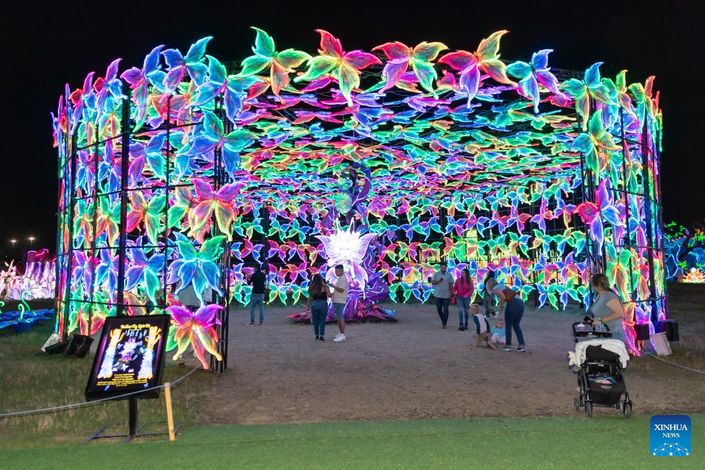 People visit the Tianyu Lights Festival in the suburb of Dallas, Texas, the United States, on Nov. 24, 2024. The event, running from Nov. 8, 2024 to Jan. 18, 2025, showcases stunning luminous art installations and nightly performances by acrobats and folk artists from China. (Photo by Dan Tian/Xinhua)