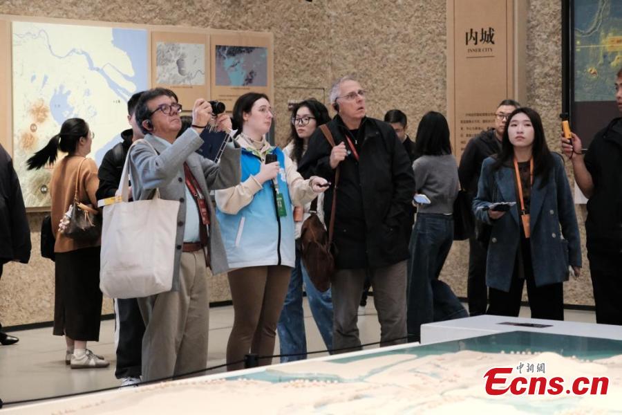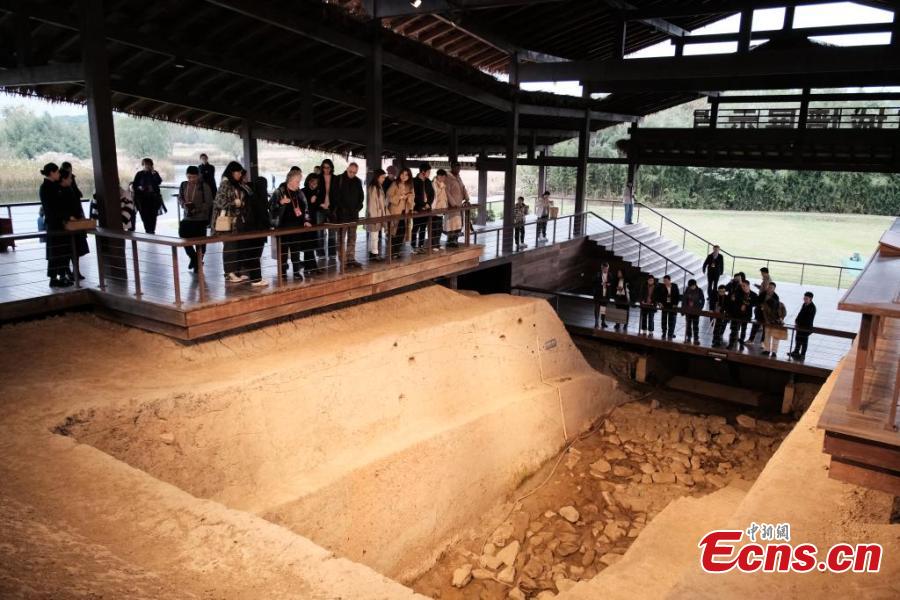 Archaeologists view cultural relics discovered from Liangzhu ruins at the Liangzhu Museum in Hangzhou, east China's Zhejiang Province, Nov. 25, 2024. (Photo: China News Service/Cao Dan)