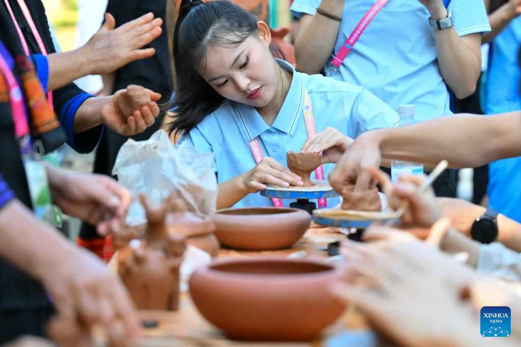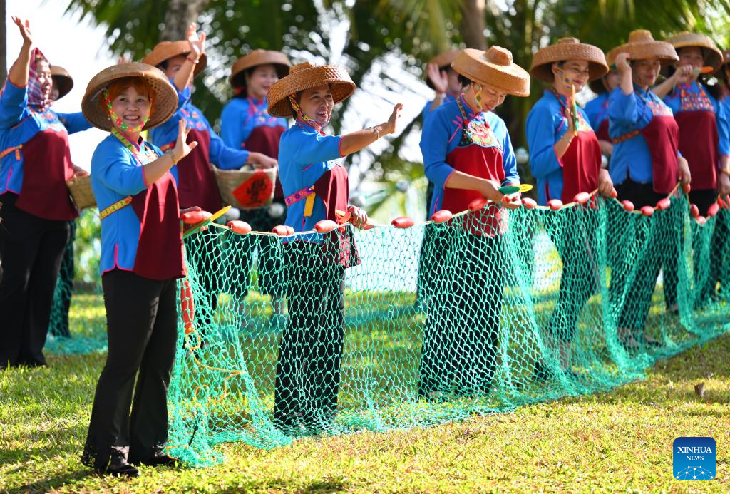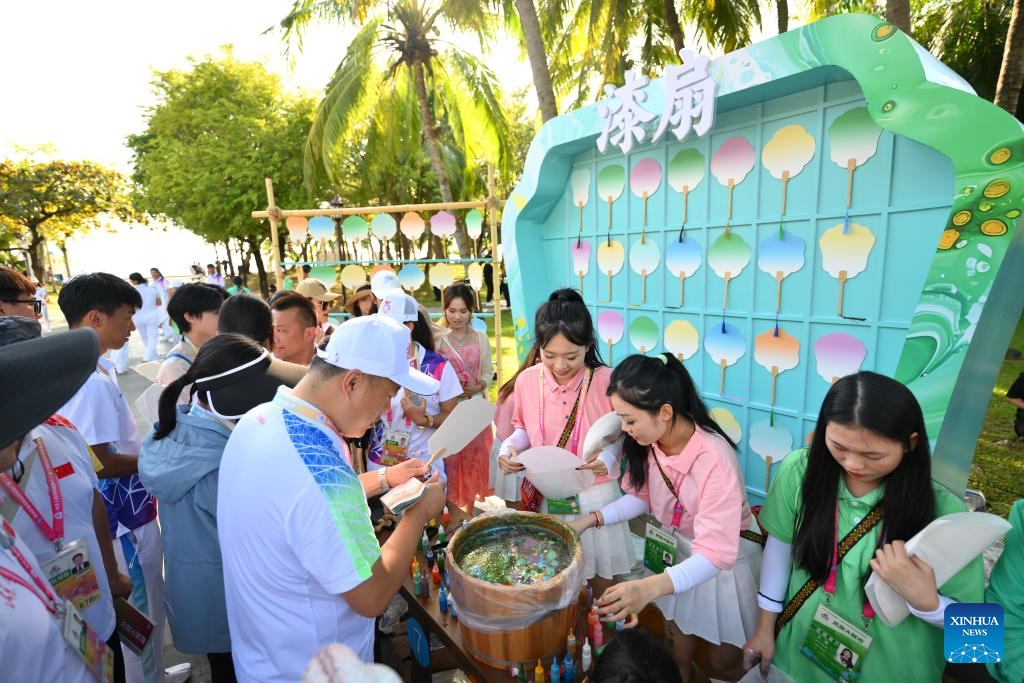 Visitors enjoy traditional handicraft making during a performance gala of the 12th National Traditional Games of Ethnic Minorities of China in Sanya, south China's Hainan Province, Nov. 26, 2024. (Xinhua/Chen Zeguo)