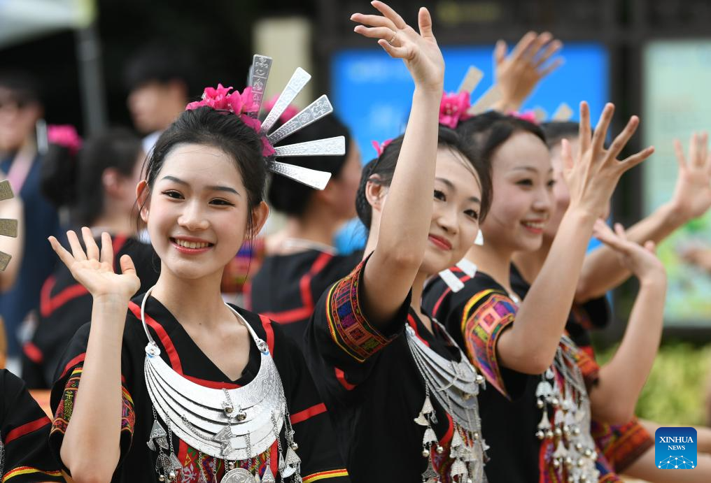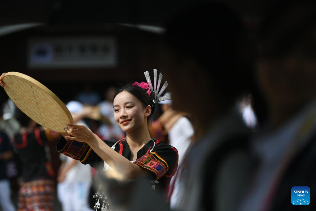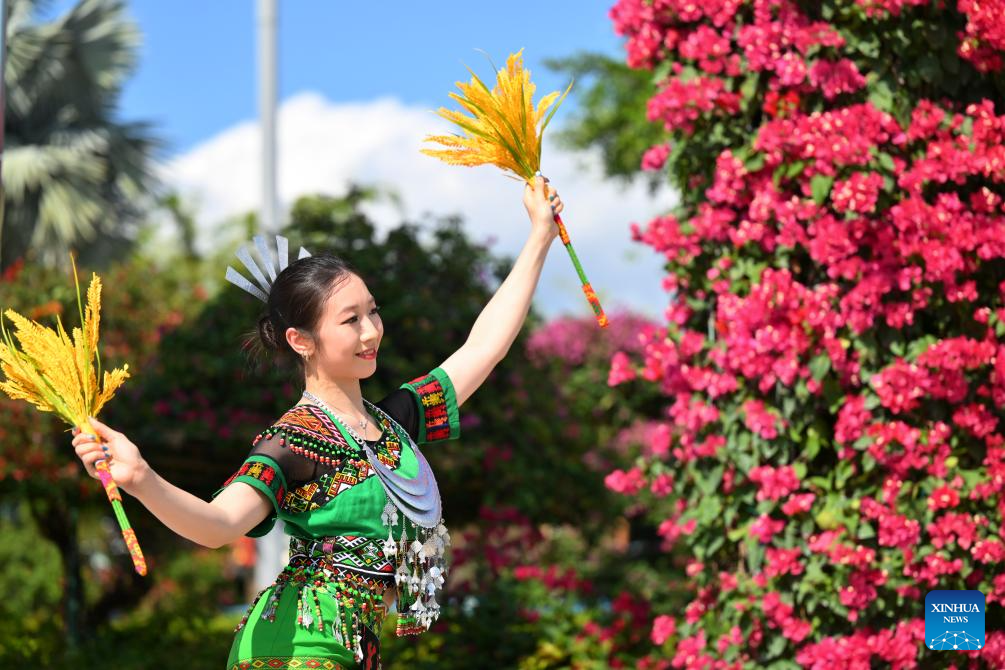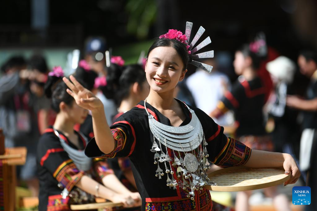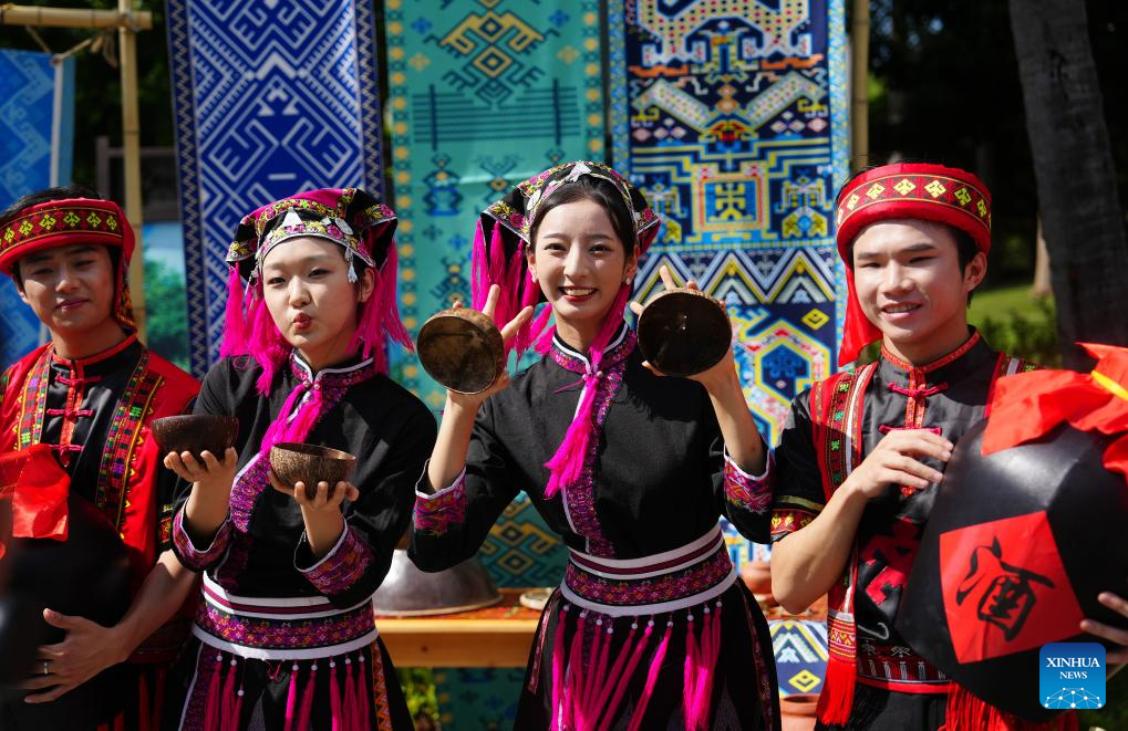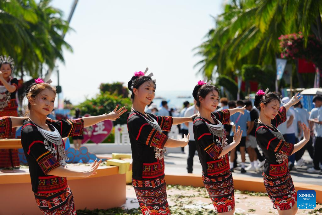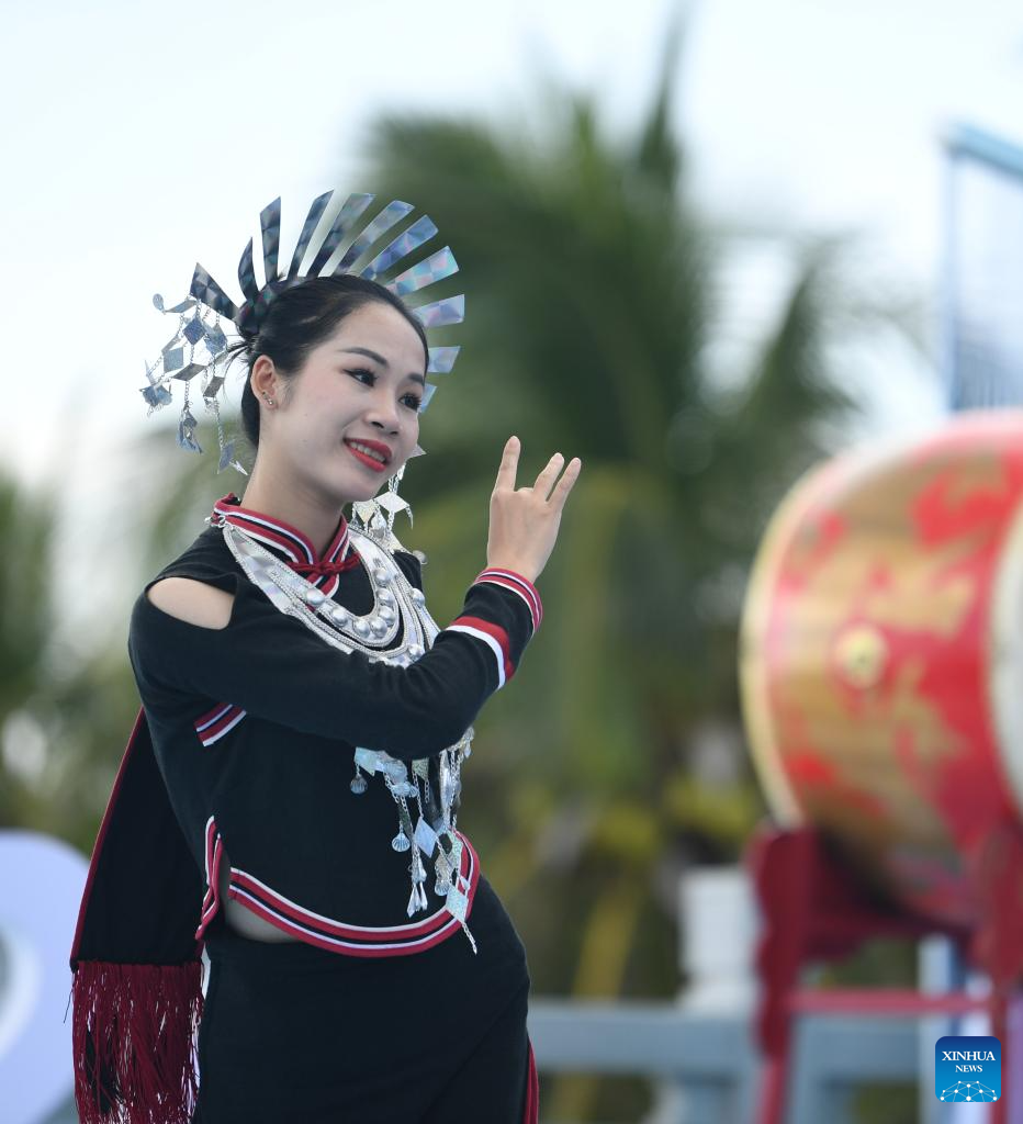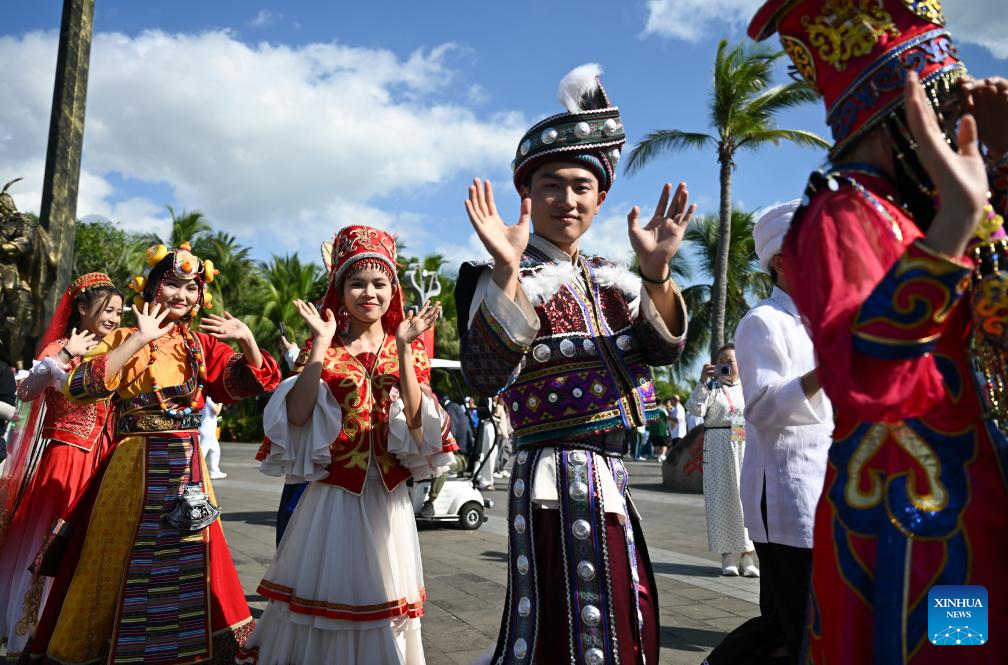 Artists welcome guests during a performance gala of the 12th National Traditional Games of Ethnic Minorities of China in Sanya, south China's Hainan Province, Nov. 26, 2024. (Xinhua/Zhang Bowen)